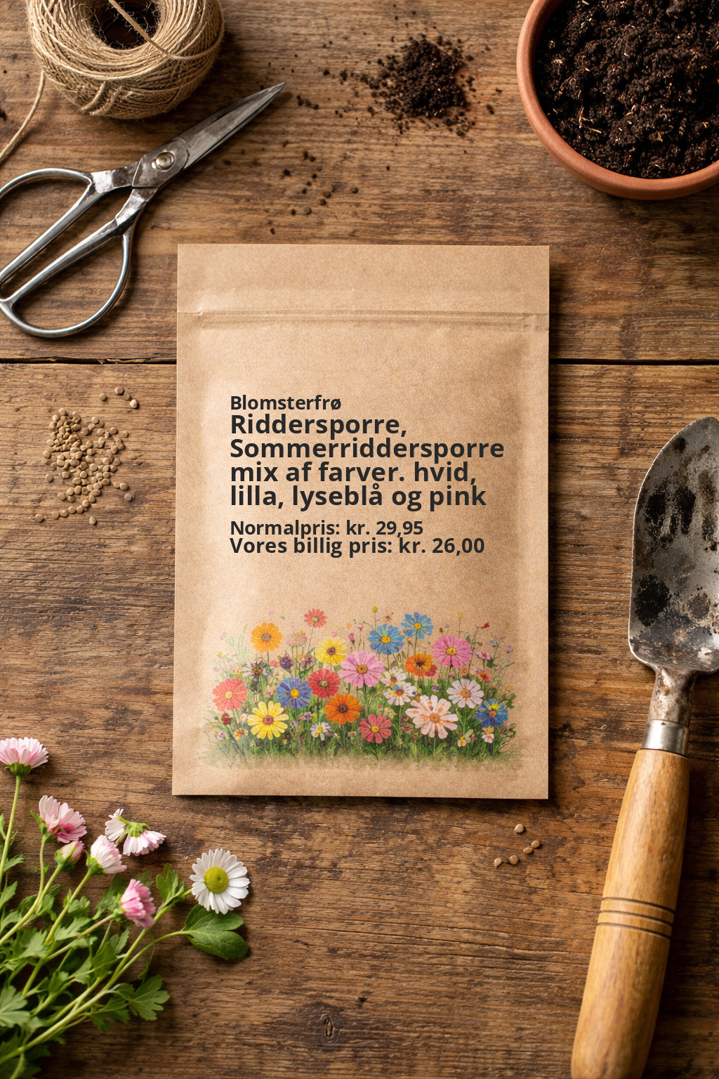 Riddersporre, Sommerriddersporre mix af farver. hvid, lilla, lyseblå og pink er en dekorativ og letdyrket sort, som trives godt i danske haver. Planterne giver lang blomstring med smukke farver og er velegnede til både bede og buketter. Sås direkte eller forkultiveres for et tidligt og frodigt resultat.
